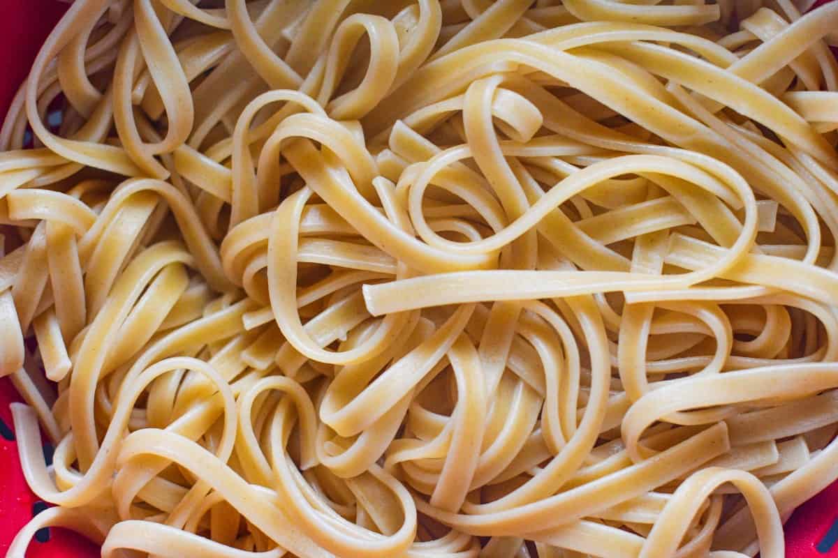 Bring a large pot of salted water to a boil. Add noodles and cook according to the package instructions, about 12 minutes. While the pasta cooks, move on to the next steps. When done, drain the pasta and set aside.