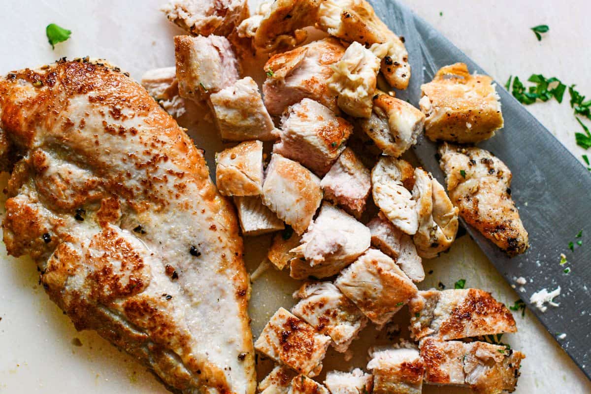 - Cook Pheasant – While the pasta is cooking, season pheasant breasts on both sides with ½ teaspoon salt, ⅛ teaspoon black pepper, garlic powder, and onion powder. Heat a large skillet over medium-high heat with 1 Tablespoon olive oil. When oil is hot, add pheasant and sauté until fully cooked through (2 min per side). Remove from pan and rest 5 minutes, then slice into bite-sized pieces.