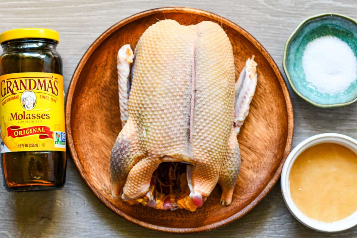 - 1 large whole duck, fully plucked, gutted and rinsed, with the neck and feet removed