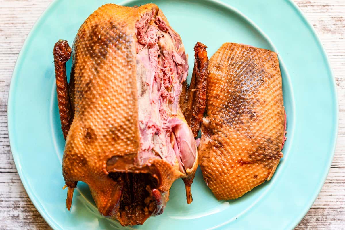 6. Remove the duck from the oven and transfer it to a cutting board. Rest for 30 minutes before slicing and serving. Remove the breasts from the carcass and slice before removing the legs and thighs and shredding the meat off those.